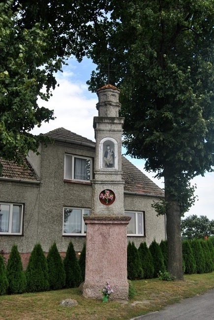Na rozwidleniu drogi powiatowej do Dzietrzkowic oraz drogi polnej prowadzącej do Wróblewa stoi czteropoziomowa kapliczka z figurą św. Jana Nepomucena. W centralnej części znajduje się przeszklona wnęka z rzeźbą świętego. Po obu jej stronach mieszczą się niszowe otwory. Podobne, nieco niżej w kształcie koła umieszczone z trzech stron słupa. Prawdopodobnie znajdowały się w nich inne obrazy bądź zdobienia. Kapliczka zwieńczona jest sześciokątną zadaszoną kolumną z żelaznym krzyżem.