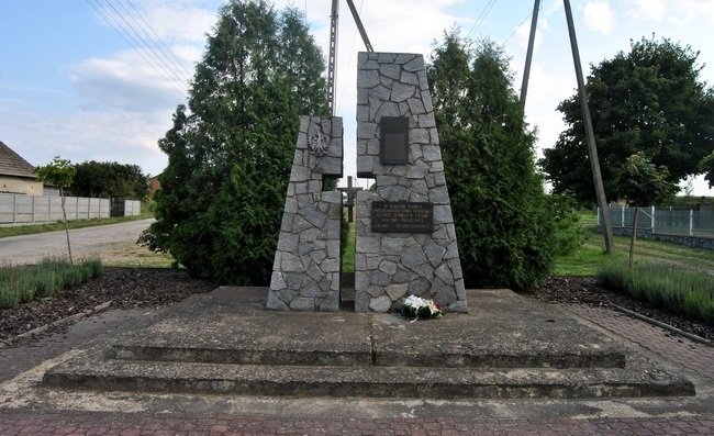 Znajdujący się obok kościoła pomnik, został wzniesiony w 1995r, poświęcony jest mieszkańcom poległym w czasie II wojny światowej. Składa się z dwóch kamiennych bloków, które z wykutymi w centralnej części lukami przypominają kształt krzyża. Na mniejszym bloku umieszczono żeliwnego orła, natomiast na większym została umieszczona płyta granitowa z informacją komu pomnik został poświęcony oraz nieco wyżej została umieszczona tablica z 1934r., wykonana z brązu, która zachowała się z poprzedniego monumentu zburzonego przez Niemców, w czasie II wojny światowej. Tabliczka jak i poprzedni pomnik był poświęcony mieszkańcom gminy którzy polegli w czasie wojny polsko- bolszewickiej w latach 1919 - 1920.