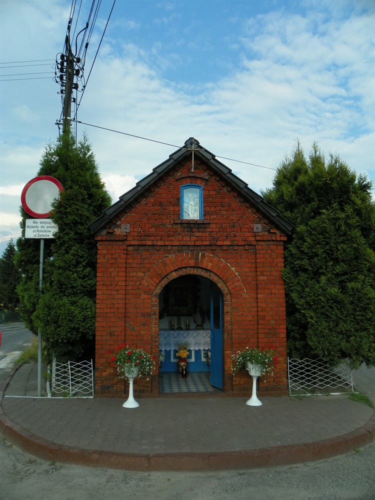 Po bokach widoczne są lekko wysunięte lica muru, stylizowane na pilastry, zwieńczone ceglaną pseudo-głowicą. W ściance szczytowej, od frontu widoczna jest wnęka zamknięta szybką, w środku której znajduje się mała figurka Najświętszej Marii Panny ze złożonymi dłońmi i okryta błękitnym płaszczykiem. W bocznych elewacjach osadzone są półokrągło zwieńczone okna, profilowane, zabezpieczone ozdobną kratą. Wewnątrz, pod tylną ścianką stoi ołtarzyk, z obrazem Matki Boskiej Częstochowskiej.