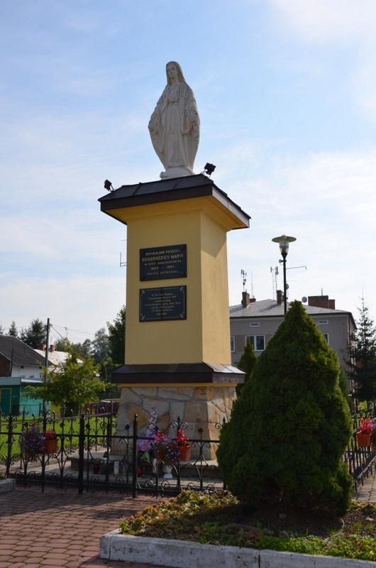 Niemal na środku jaćmierskiego rynku stoi cokół zwieńczony figurą Matki Boskiej Niepokalanie Poczętej. Matka Boska przedstawiona jest z rozłożonymi rękami ze wzrokiem skierowanym na rynek. Figura została postawiona na początku XX w.. Cokół wraz z figurą otoczony jest metalowym, ozdobnym ogrodzeniem. Na frontowej ścianie cokołu przytwierdzone są dwie tablice. Pierwsza tablica o treści: "Niepokalanie Poczętej Bogurodzicy Maryi w roku jubileuszowym 1854-1904" wmurowana została w 1904 r., natomiast druga o treści: "W 150-lecie Dogmatu Niepokalanego Poczęcia NMP z podziękowaniem za dotychczasową opiekę Matki Bożej, z prośbą o dalszą pomoc. Parafianie Jaćmierza 1854-2004" w 2004.