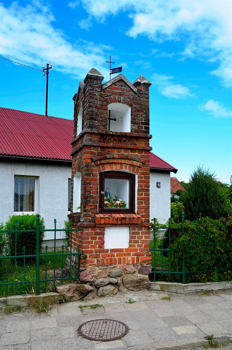 Następna usytuowana jest dokładnie w centrum, przy rozjeździe na wydzielonym terenie w pobliżu remizy strażackiej. Pochodzi z przełomu XIX i XX w. i posiada formę zwartej bryły zamkniętej dwuspadowym daszkiem zwieńczonym pięknie kutym krzyżem. Całość jest murowana z czerwonej cegły na cokole. Mimo swoich niewielkich rozmiarów kapliczka jest bogata w elementy dekoracyjne. Posiada trzy półkoliste i przeszklone nisze, wewnątrz których umieszczono figury.