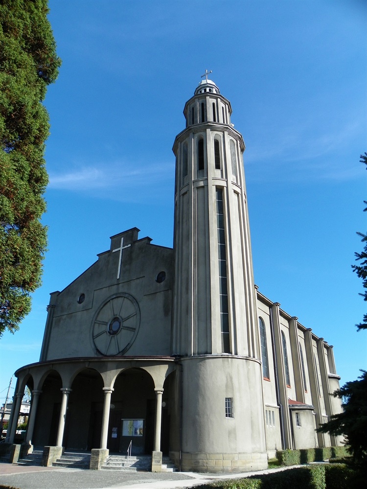 Elewacja frontowa kościoła posiada kolumnadę, przez którą wchodzi się do wnętrza budowli, a przy tym jest przekryta płaskim daszkiem. Po prawej stronie dobudowano strzelistą wieżę na rzucie koła, przypominającą trochę latarnię morską.... W ścianie szczytowej, od frontu, widoczna jest zwykle rozeta, a w tym wypadku jest to koło, być może nawiązujące do koła z szybu kopalnianego, gdyż w Łaziskach Średnich znajduje się kopalnia węgla kamiennego ''Bolesław Śmiały”. Nad kołem widoczny jest krzyż. Elewacje boczne posiadają wysokie okna, wypełnione witrażami. Bryła zamknięta jest półokrągłą absydą, wokół której dobudowano po bokach półokrągłe kaplice boczne.