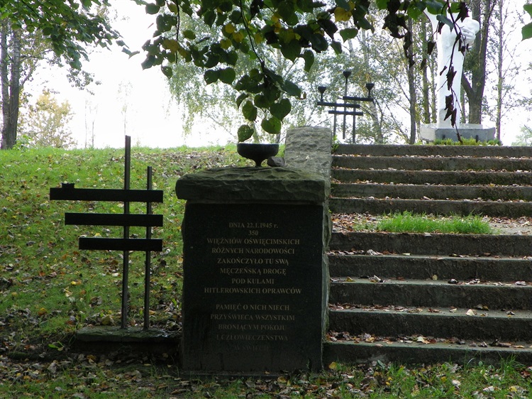 Pomnik został postawiony w dniu 08.05.1966 roku, w Tysiąclecie Państwa Polskiego. Przed pomnikiem, przy schodach na wzgórze zamontowano na murku oporowym po lewej stronie tablicę z napisem o treści: “DNIA 22.1.1945 r. 350 WIĘŹNIÓW OŚWIĘCIMSKICH RÓŻNYCH NARODOWOŚCI ZAKOŃCZYŁO TU SWĄ MĘCZEŃSKĄ DROGĘ POD KULAMI NIEMIECKICH OPRAWCÓW. PAMIĘĆ O NICH NIECH PRZYŚWIECA WSZYSTKICH BRONIĄCYCH POKOJU CZŁOWIECZEŃSTWA NA ŚWIECIE”. Po prawej stronie murku oporowego widnieje napis: “OFIAROM HITLERYZMU”.