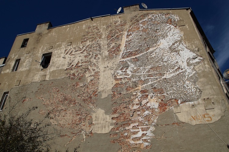 Istnieje już na portalu Polska Niezwykła artykuł pt: "Legalne graffiti" gdzie trafiają fotografie łódzkich murali. Ale ten postanowiłem przestawić osobno ponieważ jest inny. Co go wyróżnia?... technika wykonania. Zazwyczaj malarze street artu swoje prace wykonują przy pomocy farb, pędzli, sprayu. Natomiast ten został wykuty w tynku przy pomocy młota udarowego SDS i innych ręcznych narzędzi. Autorem tego muralu/płaskorzeźby jest Portugalczyk Vhils. Obraz powstał w październiku 2014 r. w przeciągu jednego tygodnia (artyście pomagało dwóch pomocników) i stał się 34 w Galerii Urban Forms.