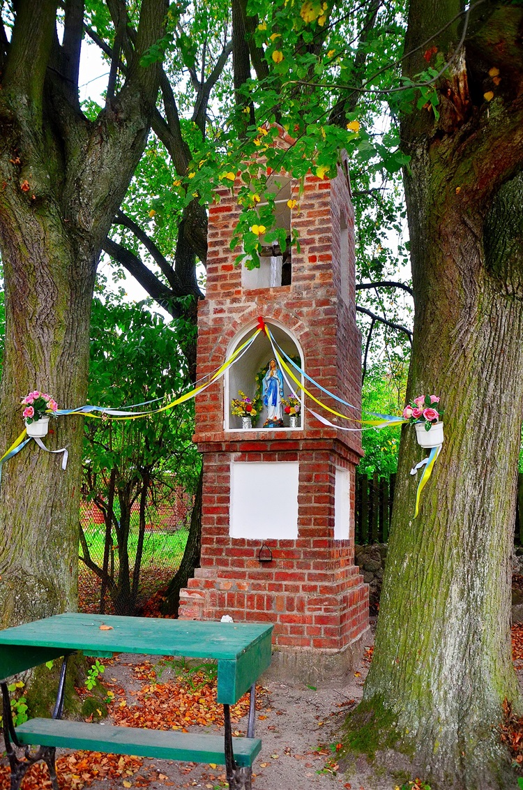 W samym centrum tego miejsca usytuowana jest bardzo ciekawa kapliczka dzwonniczkowa, pochodząca z końca wieku XIX lub początku XX. Nosi ona cechy neogotyckie, jest murowana z czerwonej cegły licowej, trójkondygnacyjna z uskokowym cokołem. Środkowa część budowli to ostrołukowa duża wnęka wewnątrz której umieszczono figurę Matki Bożej w otoczeniu kwiatów, górna kondygnacja to prześwit z miejscem na dzwonek.