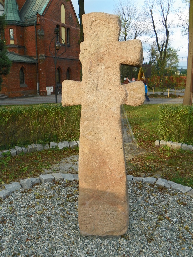 Datuje się jego powstanie na rok 1628. Wykonany został z piaskowca, stąd jego jedno ramię nie doczekało czasów obecnych, ale jeszcze można zauważyć m.in. skrót napisu łacińskiego: “AN.D.I.628.C.E.E.S.I.M.6.SC”, co może znaczyć: “W roku Pańskim 1628 został zbudowany kościół św. Jerzego Męczennika, a 6 września został konsekrowany”. Oczywiście tekst dotyczy prawdopodobnie poprzednika obecnej świątyni pod tym samym wezwaniem. Znawcy tematu przypuszczają, że krzyż może być starszy, niż się go datuje na podstawie wyrytych napisów, a mógł być użyty jako kamień węgielny pod budowę drugiego kościoła parafialnego - możliwe, że wybudowanego z drewna. Między ramionami krzyża widoczny jest mały, wyryty krzyż w formie płaskorzeźby.