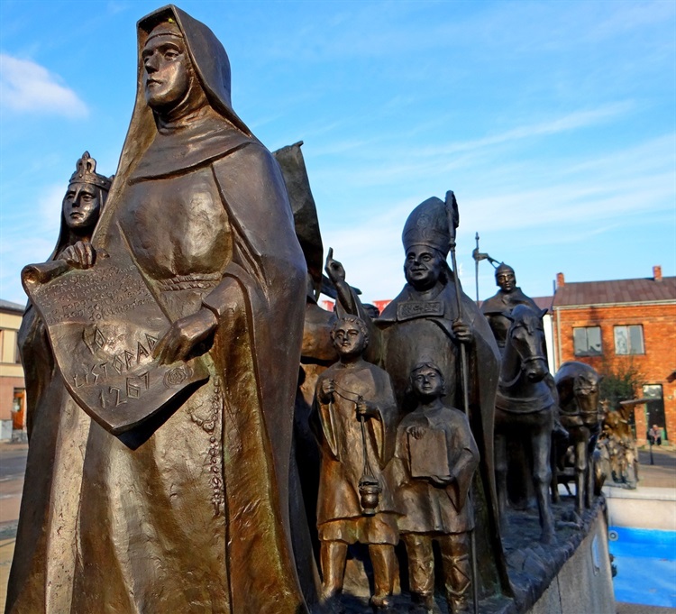 Pomnik jest plastycznym przedstawieniem najdawniejszej historii miejscowości. Profesor Dźwigaj bardzo trafnie nazwał go „zatrzymanym orszakiem”. Dłuższa, 4,5 metrowa część rzeźby przedstawia Salomeę Piastównę trzymającą w dłoni akt lokacyjny. Czytamy na nim: „Rzeczy zasługujące na poparcie godzi się umacniać i utwierdzać dokumentami. 10 listopada 1267”. W orszaku dojrzeć można Bolesława Wstydliwego (brata Salomei), św. Kingę (jego żonę), są biskupi, rycerze, dwórki, kupcy na wozach, zwierzęta. Niektórzy z nich niosą dary.