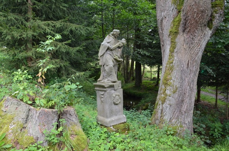 Nieopodal mostku nad potokiem Jelonek, obok okazałej lipy znajduje się figura św. Jana Nepomucena. Jest to barokowa, kamienna rzeźba wykonana w 1753 r. Święty przedstawiony jest w widocznym kontrapostem postaci, z metalową aureolą nad przykrytą biretem głową. Na lewym ramieniu trzyma kamienny krzyż.