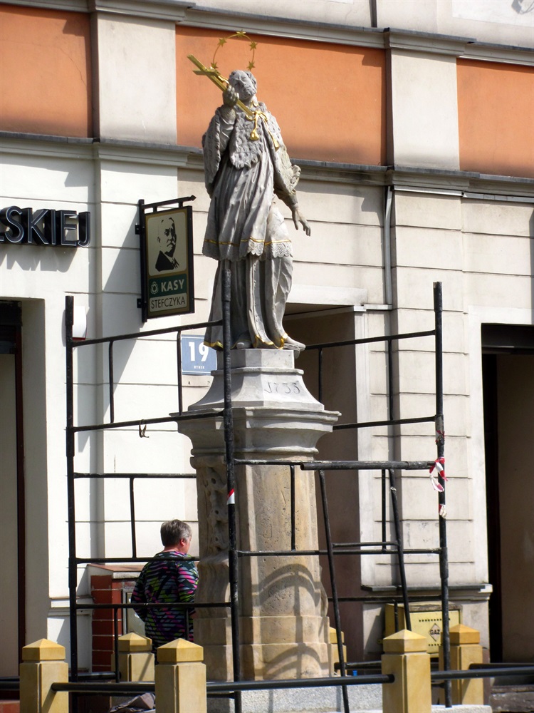 Na rynku w Strzegomiu stoi barokowa figura św. Jana Nepomucena z 1735 roku. Podczas mojej wizyty w mieście w lipcu, obiekt był w trakcie remontu. Przywrócono mu utracone na rzecz wandali dłonie oraz przedramię a także przetrąconą aureolę. Podczas remontu opiewającego na kwotę 24 tysięcy dodano pomnikowi nowy atrybut czyli krzyż.
