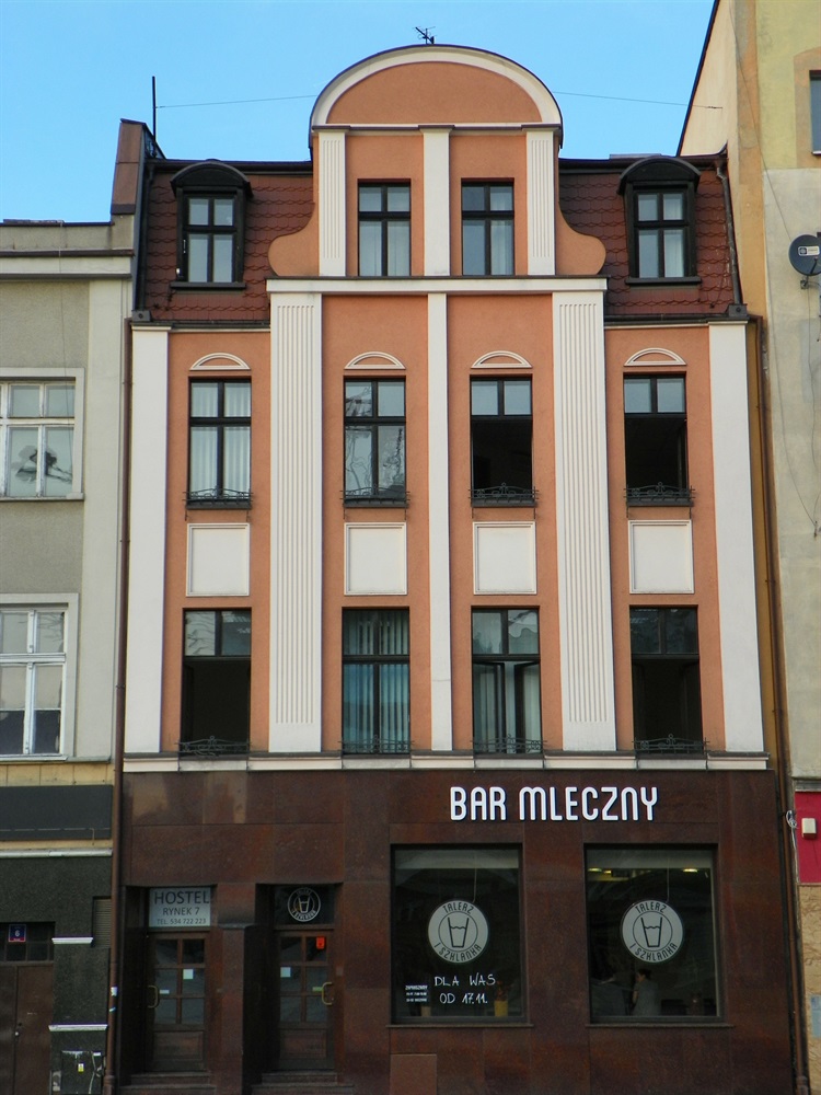 Budynek jest trójkondygnacyjny z użytkowym poddaszem, wieńczącym bryłę budynku. Od frontu widoczne są pilastry dzielące fasadę na pola, między którymi osadzone są proste okna. Otwory okienne w trzeciej części kondygnacji ozdobiono skromnymi powiekami. Niewątpliwie najciekawszym elementem architektonicznym kamienicy jest ścianka szczytowa, w której osadzono dwa okna, a zarazem zwieńczono ją półokrągłym łukiem, po bokach osadzając jakby “ucha”. Między oknami widoczne są pilastry jakby podtrzymujące zwieńczenie ścianki szczytowej. Trochę jakby wyglądem ścianka szczytowa w fasadzie głównej nawiązuje do budynku dawnego ratusza w Dąbrówce Małej....