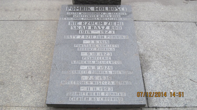 Płyta znajduje się na chodniku przy ulicy Kolejowej, naprzeciwko dworca kolejowego. Pomnik odsłonięto 14 września 1924 roku, wzniesiono go z funduszy ze składek społecznych, a jego twórcą był Jan Raszka. Pierwotnie obelisk miał 6 metrów wysokości, a na cokole po jego bokach, znajdowały się dwie postaci, legionisty i górnika powstańca. Niemcy zniszczyli pomnik we wrześniu 1939 roku. Pomnik upamiętniono 11 listopada 1993 roku tablicą z jego historią i zaznaczonym miejscem gdzie padał jego cień.