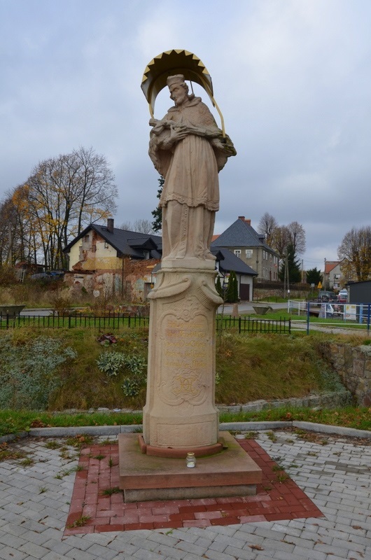 Kamienna figura św. Jana Nepomucena znajduje się na placu w centrum wsi. Na obecne miejsce została przeniesiona z parku dworskiego, po sprzedaniu dworu wraz z przyległym terenem prywatnemu właścicielowi. Rzeźba poddana renowacji w 2011 r. wieńczy ozdobny cokół, na którym widnieje inskrypcja z chronostychem w języku niemieckim – treść inskrypcji po tłumaczeniu "Święty Janie Nepomucenie wstaw się za nami pobożnymi wyznawcami Boga" oraz rok 1787 lub 1789. Figura świętego podczas renowacji nakryta została półokrągłym blaszanym daszkiem.