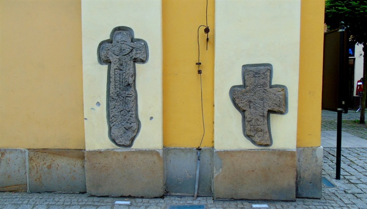 W Jeleniej Górze zobaczyć możemy dwa kamienne krzyże pokutne, których powstanie szacuje się pomiędzy XIV i XVI wiekiem. Oba monolity wmurowane zostały w 1934 r. w ścianę kościoła Najświętszej Marii Panny, dzisiejszej cerkwi Świętych Apostołów Piotra i Pawła. Na większym krzyżu wyryto miecz i kuszę, które były prawdopodobnie narzędziami zbrodni. Na mniejszym widnieje prostokąt.