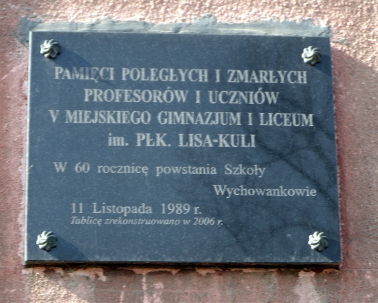 Na elewacji budynku Zespołu Szkół Zawodowych im. Piotra Wysockiego przy ul. Odrowąża 75 w warszawskiej dzielnicy Targówek znajduje się tablica poświęcona pamięci poległych i zmarłych profesorów i uczniów V Męskiego Gimnazjum i Liceum im. Płk Lisa – Kuli. Zawieszona została 11 listopada 1989 przez wychowanków, następnie zrekonstruowana w 2006 r.