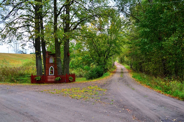 Zupełnie inaczej wygląda sytuacji podobnej budowli stojącej na rozstaju dróg. Wybudowano ją w 1932 r. o czym oznajmia metalowa chorągiewka na dachu, jest to kapliczka typu dzwonniczkowego z prześwitem w górnej kondygnacji. Jest bogato zdobiona, z każdej strony duża i przeszklona ostrołukowa nisza zawierająca figury. Ta bardzo zadbana kapliczka silnie nawiązuje do warmińskiej tradycji związanej z budowaniem takich obiektów, otacza ją bowiem sztachetowy płot i cztery dorodne lipy przy narożach.