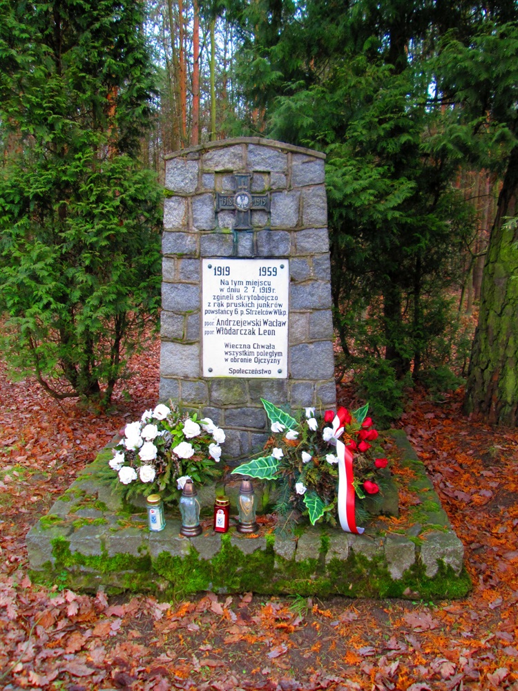 Niedaleko Kąkolewa, przy leśnej drodze prowadzącej w kierunku Trzebani znajduje się pomniki upamiętniający powstańców wielkopolskich. Byli to żołnierze 6 Pułku Strzelców Wielkopolskich – podporucznik Wacław Andrzejewski oraz podporucznik Leon Włodarczak. Polegli dnia 2 lipca 1919 roku podczas podstępnego ataku Niemców, łamiących zawarty rozejm. Pomnik ufundowany został przez społeczeństwo w 1959 roku. Nad tablicą pamiątkową umieszczono krzyż powstańczy.