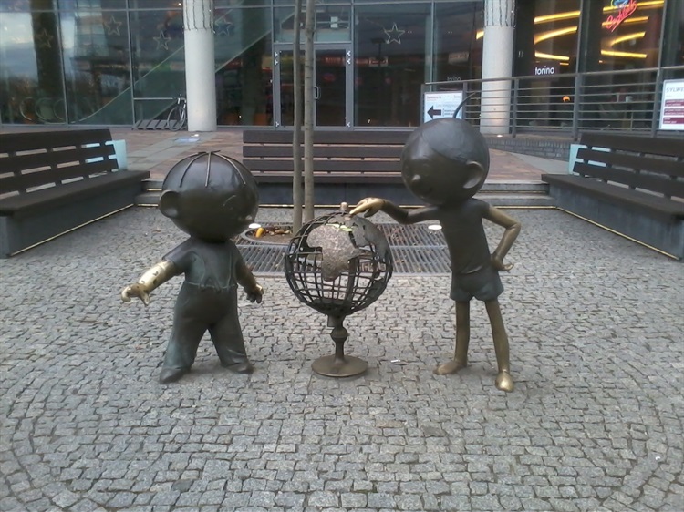 Pomnik odsłonięto 19 maja 2011 roku i przedstawia obie postacie z globusem między nimi. Wysokość to ok. 130 cm, waga ok. 254 kg. Postacie zostały stworzone w 1962 r. przez Władysława Nehrebeckiego, a imiona zaczerpnięto z polskiego filmu "Bolek i Lolek" z 1936 roku. Obszerny artykuł na temat Bolka i Lolka: https://pl.wikipedia.org/wiki/Bolek_i_Lolek.