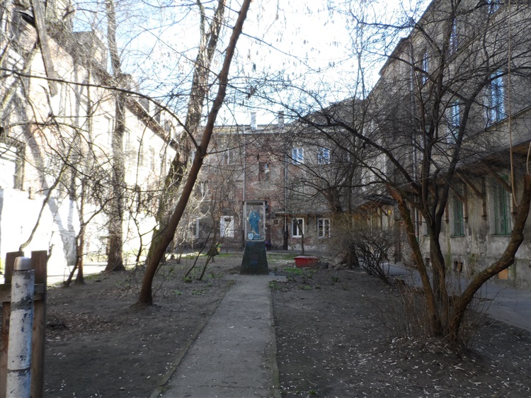 Na podwórku kamienicy przy ulicy Okrzei 30 stoi kapliczka Matki Boskiej w niebieskiej szacie. Figura jest w szklanej skrzynce na cokole z tablicą na której jest wyryty napis „O Mario bez grzechu poczęta, módl się za nami. Dn. 17. 7.1943”.