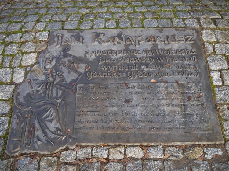 Jan Kanapariusz (Ioannes Canaparius) był mnichem benedyktyńskiego opactwa na rzymskim Awentynie pod koniec X w. Dlaczego więc ufundowano mu tablicę w Oliwie? Otóż w przypisywanym mu, powstałym ok. 1000 r. "Żywocie św. Wojciecha" po raz pierwszy wspomniano nazwę Gdańska: "urbs Gyddanyzc". Tablica umieszczona jest niemal zupełnie płasko w bruku, przy bocznym wejściu do parku oliwskiego.