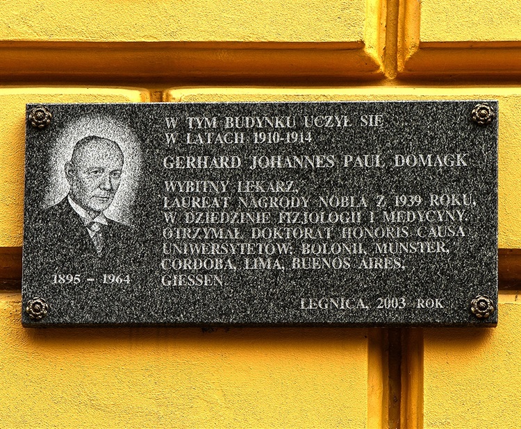 Na budynku I Liceum Ogólnokształcącego w Legnicy widnieje tablica upamiętniająca niemieckiego lekarza patologa i mikrobiologa Gerharda Johannesa Paula Domagka. Gerhard Domagk w latach 1910-1914 uczył się w Ewangelickim Męskim Gimnazjum Miejskim w Legnicy, które mieściło się w budynku obecnej szkoły I LO. Wybitny lekarz żył w latach 1895-1964. W 1939 roku otrzymał nagrodę Nobla w dziedzinie fizjologii i medycyny. Pamiątkową tablicę odsłonięto w 2003 roku.