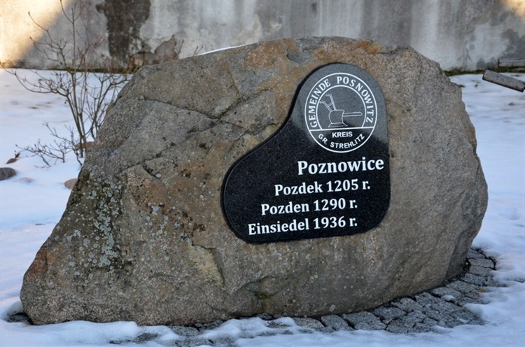 Pierwsze wzmianki o powstaniu wsi leżącej obecnie w woj. opolskim sięgają początków 1200 r. Na przestrzeni wieków zmieniała się również nazwa miejscowości, która należy do grupy nazw patronimicznych i pochodzi od imienia założyciela wsi Poznana lub Poznomira. Według niemieckiego językoznawcy Heinricha Adamy, w wydanym w 1888 r. dziele o nazwach miejscowości na Śląsku wymienia się miejscowość Poznacz ("Dorf des Posener" czyli po polsku "Wieś Poznaniaków"). Kamień z tablicą nazwy wsi usytuowany jest przy zewnętrznym murze kościoła p.w. św. Michała Archanioła.