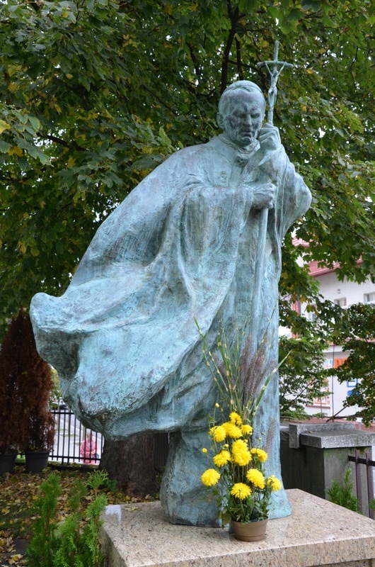 Pomnik papieża Jana Pawła II stoi od czerwca 2011 r. przed kościołem Przemienienia Pańskiego. Został wykonany z brązu wg projektu Agnieszki Świerzowicz i Marka Maślańca. Figura papieża opartego na pastorale wieńczy cokół z inskrypcją o treści: Bł. Jan Paweł II, Papież. 1978-2005.