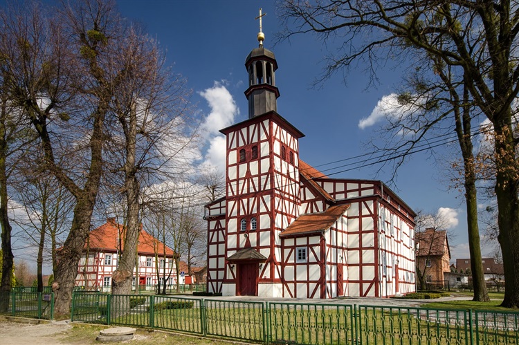Wybudowany w 1642 roku w Praczach Odrzańskich (obecnie część Wrocławia) szachulcowy kościół był świątynią ewangelicką. Zarówno on jak i znajdujący się w pobliżu również szachulcowy budynek dawnej plebanii ewangelickiej z 1626 roku znajdują się w rejestrze zabytków.