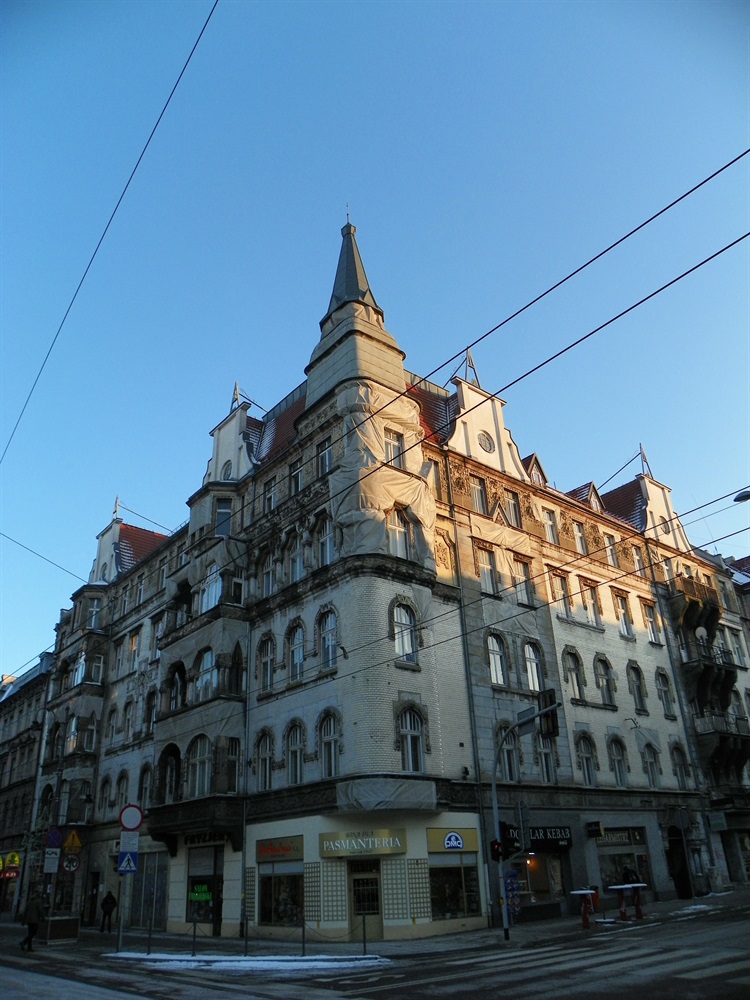 Prawie na końcu ulicy 3 Maja w Katowicach, na rogu z ulicą Juliusza Słowackiego stoi katowicka “Biała dama”, czyli jedna z ładniejszych w tej części miasta. Została zbudowana w początkach XX wieku w stylu historyzmu według projektu Paula Frantziocha, w miejscu pierwszej w Katowicach synagogi. Jest to budynek murowany, nieotynkowany, przekryty dachem półmansardowym, w którego w połaci od frontu widoczne są ścianki szczytowe z małymi, okrągłymi okienkami. Między nimi widoczne są nieco mniejsze lukarny zadaszone dwupołaciowymi daszkami.