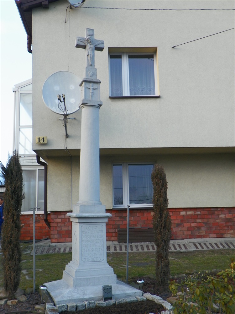 Krzyż osadzono na podstawie sześcianu, na którego ściankach widoczne są wizerunki świętych: św. Jana Nepomucena, św. Wawrzyńca - patrona m. in. studentów, ubogich, piekarzy, od pożarów, św. Szymona apostoła - patrona m. in. spawaczy czy garbarzy. W czwartym polu, symetrycznie pod Ukrzyżowanym Chrystusem, widoczna jest ponownie postać Ukrzyżowanego, lecz mniejszych rozmiarów. Obecnie, z racji lat, postać Chrystusa może przypominać postać Ukrzyżowanego Dzieciątka...jednak pozostawiam tę kwestię do indywidualnej oceny.....