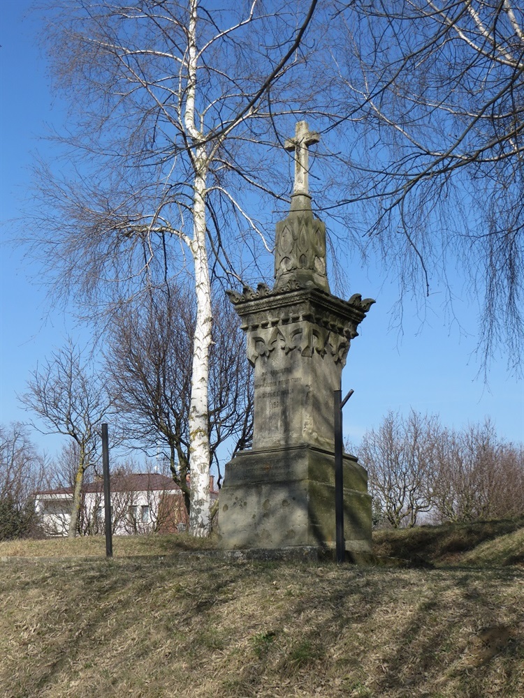 Obiekt wzniesiony jest z szarego piaskowca i ma formę krzyża łacińskiego. Dzisiaj stoi na skarpie przed ożarowskim kościołem ale nie jest to jego pierwotne miejsce.
