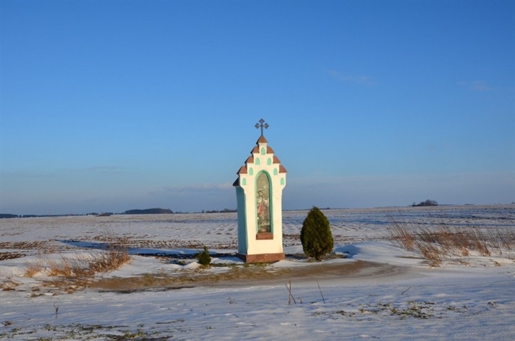 Na końcu wsi, na skraju polnej drogi stoi murowana i otynkowana kapliczka nakryta dwuspadowym daszkiem. W ścianie frontowej zakończonej schodkowym trójkątem i zwieńczonym metalowym krzyżem wykonana została ostrołukowa nisza. Wewnątrz umieszczona została figurka Jezusa z barankiem na ramionach. Kapliczka pochodzi prawdopodobnie z XVIII wieku.