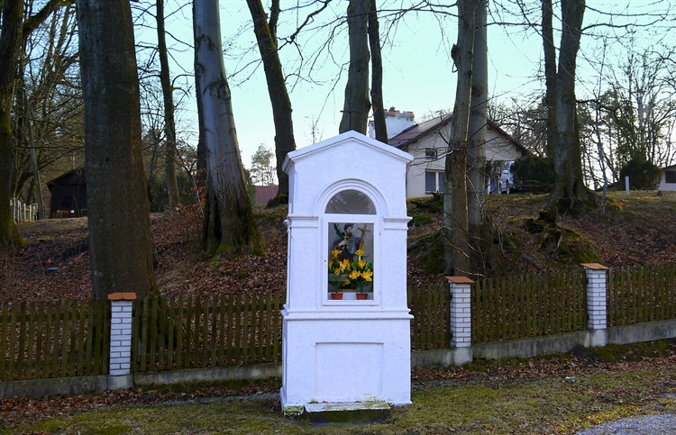 Kapliczka stoi właściwie na dawnej grobli, którą prowadzi obecnie droga gminna a powyżej niej, na rozległej wydmie znajdują się zabudowania leśnictwa. W pobliżu była jeszcze w latach 60-tych najwyższa w tych okolicach leśna wydma (244 m), zwana Królewską Górą. Jak długo stoi tu kapliczka nie wiem ale wygląda na dosyć wiekową.