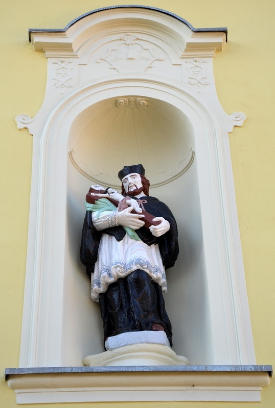 W zamkniętej półokrągło niszy wykonanej w zewnętrznej ścianie kościoła p.w. św. Marcina ustawiona jest kamienna figura św. Jana Nepomucena. Święty przedstawiony jest charakterystycznej pozie tzw. kontrapoście w szatach kapłańskich (sutannie, komży, pelerynie, birecie na głowie) i krzyżem trzymanym na gałązce palmy.