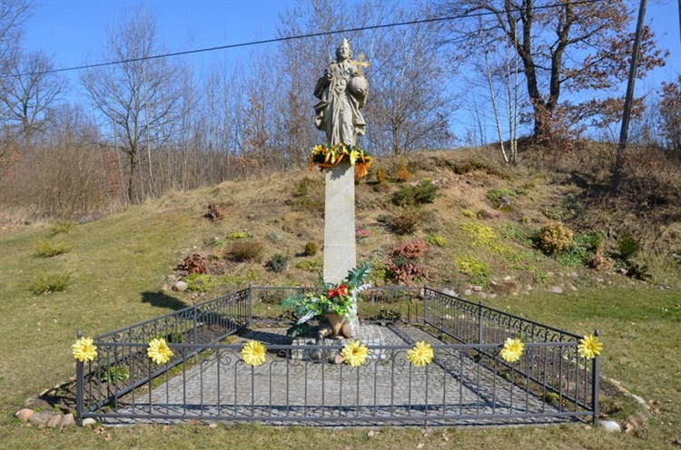 Na skraju rozwidlenia dróg znajduje się pomnik Chrystusa Króla. Figura wykonana z kamienia stoi na wysokim kamiennym postumencie. Chrystus przedstawiony jest z instygniami władzy królewskiej - w złotej koronie na głowie oraz jabłkiem zwieńczonym złotym krzyżem. Pomnik otacza niskie, ozdobne metalowe ogrodzenie.