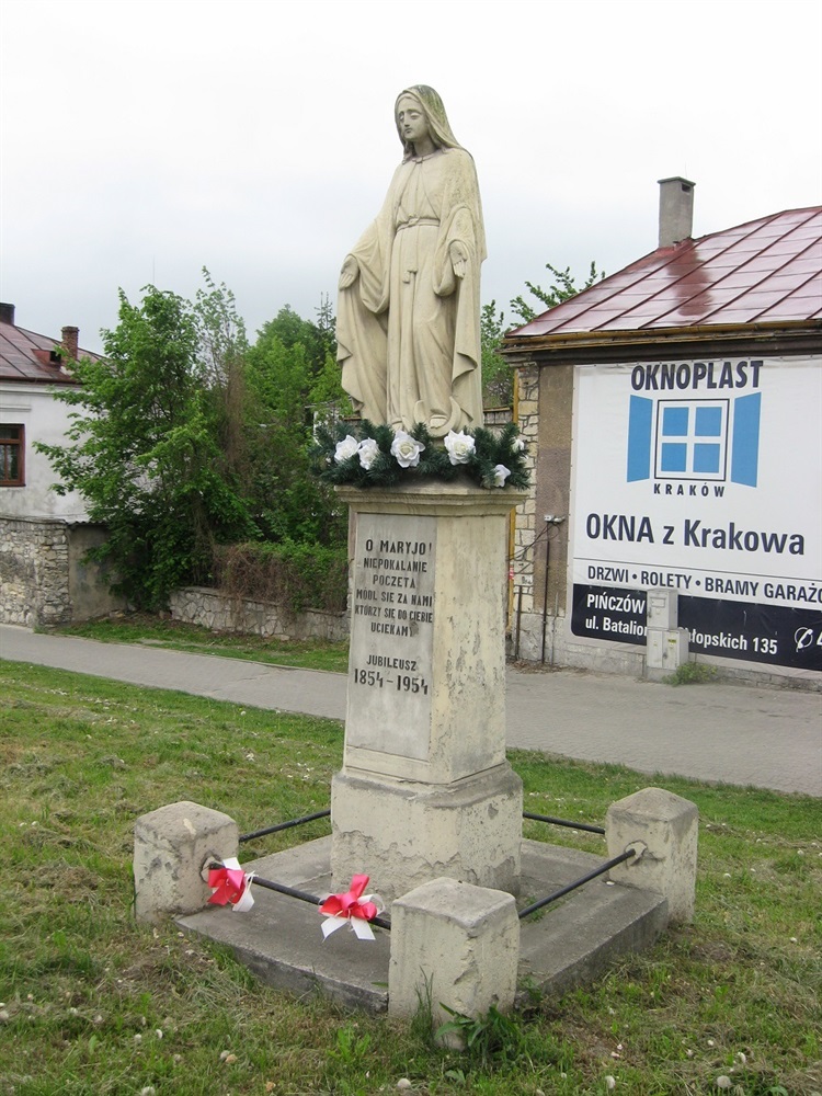Na rogu ul.Marszałka Józefa Piłsudskiego i Nowy Świat w Pińczowie znajduje się kamienna figura Matki Boskiej. Na cokole są dwie daty 1854-1954 zapewne jubileuszu ogłoszenia przez papieża Piusa IX prawdy jako dogmatu o Niepokalanym Poczęciu Maryi. Powyżej inskrypcja "O Maryjo Niepokalanie Poczęta módl się za nami grzesznymi,którzy się do ciebie uciekamy".