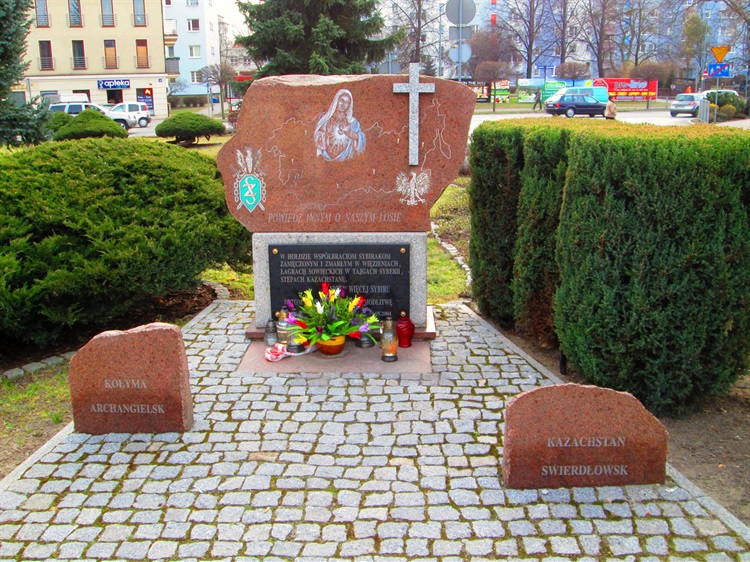 Przed głównym pomnikiem, nieco z przodu widzimy dwie płyty z miejscami zesłań Polaków: Kołyma, Archangielska, Kazachstanu, Swierdłowska.