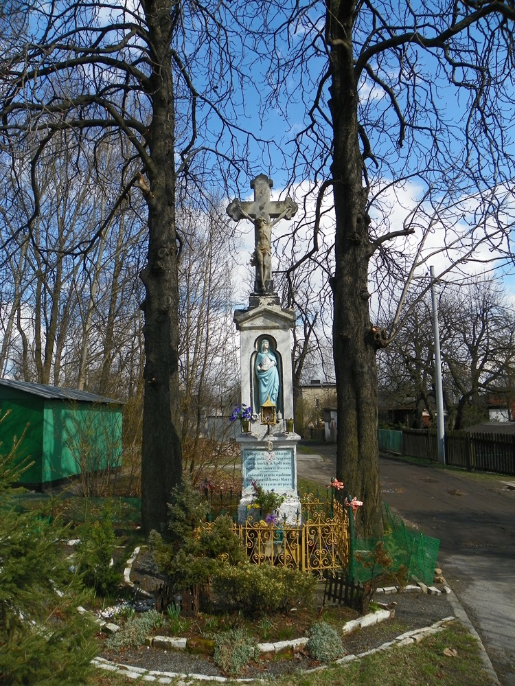 Sam krzyż datowany jest na rok 1904, a został wykonany w tzw. “prosty sposób”, bez szczególnych ozdób, otoczony niskim, kutym (może oryginalnym) płotkiem koloru żółtego. Wokół niego okoliczni mieszkańcy stworzyli coś w rodzaju skwerku, ozdabiając go m. in. iglakami. Od frontu, nad płytką niszą z cytowaną wcześniej inskrypcją zamontowano nieduże lampiony, a w nieco głębszej bruździe ustawiono figurę Matki Boskiej Bolesnej z dłońmi złożonymi w geście żałoby, może nawet “zapytania”: “dlaczego?”. Rzeźba przykryta jest błękitną pelerynką.