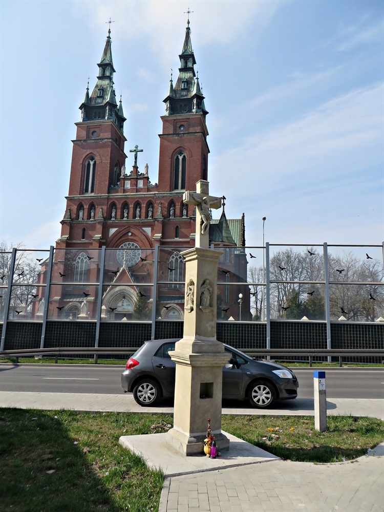 Naprzeciw kościoła Świętego Krzyża w Kielcach stoi kapliczka - kamienny krzyż umieszczony na wysokim dwustopniowym postumencie. W płytkiej wnęce na frontowej ścianie tegoż postumentu znajduje się płaskorzeźba św. Jana Nepomucena, opatrzona u góry napisem "S. Jan". We wnękach bocznych znajdują się płaskorzeźby św. Rozalii i św. Ignacego. Figury świętych tak jak i inskrypcja są nieco zatarte, być może wskutek intensywnej renowacji. Kiedyś obiekt był polichromowany.Nieznana data wystawienia i fundacji.