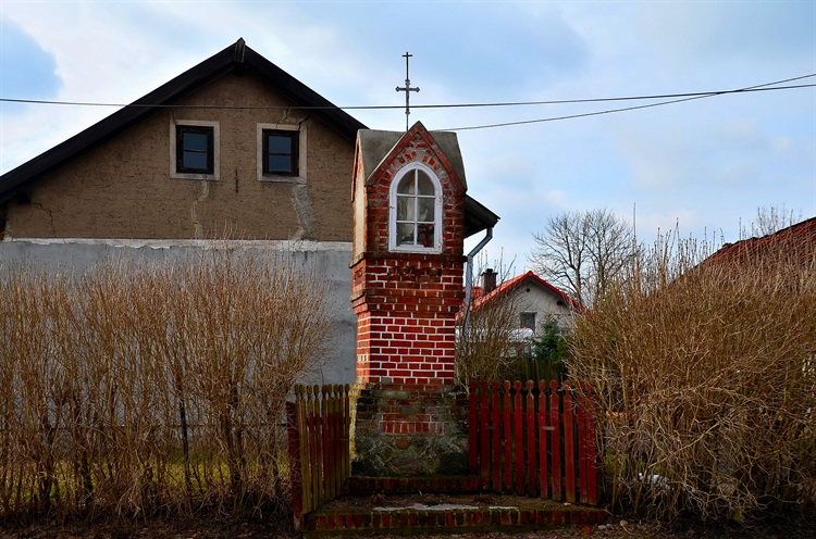 Jest to tradycyjna budowla wystawiona w stylu neogotyckim na przełomie XIX i XX wieku, zlokalizowana jest obecnie na prywatnej posesji. Kapliczka została wybudowana z czerwonej cegły licowej na podmurówce z kamieni polnych, dwudzielna część bazowa posiada wyraźnie podkreślony węższy korpus opięty gzymsem. Głównym elementem dekoracyjnym kapliczki jest duża ostrołukowa nisza umieszczona od frontu, zamknięta oszklonymi drzwiczkami podziałem szprosowym. Wewnątrz niej figura Matki Bożej. Całość budowli przykrywa krzyżowy daszek z czterema szczytami, w jego zwieńczeniu umieszczono smukły krzyżyk z nałożonym krucyfiksem.