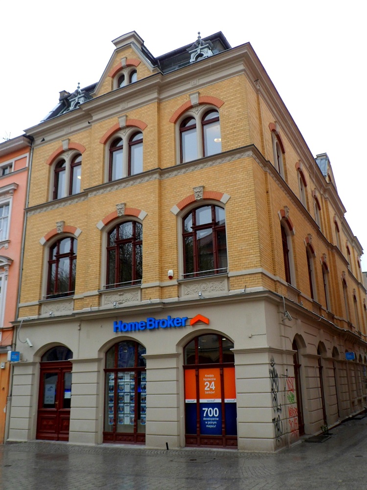 Budynek o elewacjach licowanych ceramiczną cegłą urozmaiconych delikatnymi dekoracjami sztukatorskimi zbudowany został dla Domu Bankowego H.M.Flisbachs Witwe z siedzibą w Głogowie. W 1924 r. nowym właścicielem został bank z Darmstadt, który użytkował go do 1937 r. W roku tym w kamienicy filię otworzył Dresdner Bank, który przejął upadający Darmstädter und Nationalbank.