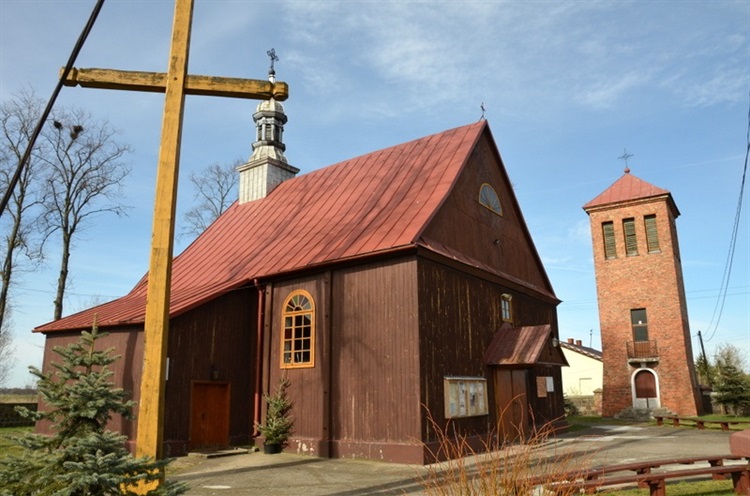 Obecny kościół wzniesiony w 1754 r. z fundacji właściciela wsi Jakuba Dąbrowskiego jest drugim kościołem we wsi. Poprzedni spłonął w 1734 r. Jednonawowy kościół z węższym zamkniętym wielobocznie prezbiterium został zbudowany z drewna, nakryty jest dwuspadowym blaszanym dachem zwieńczonym niewielką wieżyczką. Po obydwu stronach nawy wzniesione są na planie prostokąta dwie kaplice.