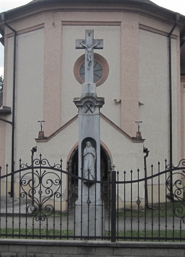 Krzyż pochodzi z XIX wieku, ponadto w wysokim cokole, na którym się znajduje umieszczono figurę Matki Bożej Bolesnej. Krzyż znajduje się przed kościołem pw. Niepokalanego Serca Najświętszej Maryi Panny od strony ul. Batalionów Chłopskich.