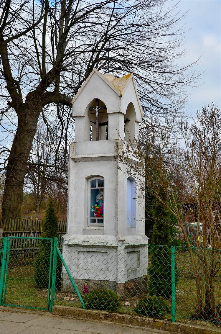 Przy wiejskiej drodze prowadzącej przez starszą część tej wsi umiejscowione są dwie neogotyckie kapliczki. Wybudowano je na przełomie XIX i XX wieku. Na początku tego traktu tuż przy dawnej szkole, na wydzielonym terenie znajduje się dwupoziomowa kapliczka posiadający charakter dzwonniczkowy. Wizualnie jest to dość wysoka budowla z widocznym podziałem bazy i korpus, który mocno podkreślono wąskimi narożnymi przyporami i blendami. Dolny poziom zdobi łukowa nisza z figurą Madonny z Dzieciątkiem. Górna część, to prześwit z krucyfiksem i sygnaturką. Całość przykryta wielospadowym daszkiem zwieńczonym kutym krzyżem, niestety wtórnie otynkowanie przykryło oryginalną czerwoną cegłę.