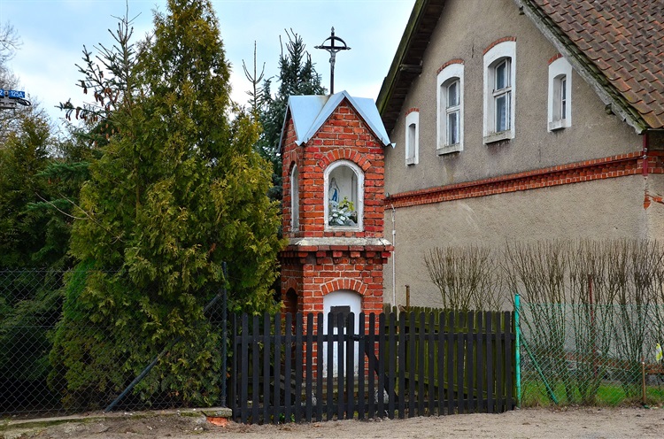 Dolny poziom oddzielony ceglanym fryzem z okapem, to łukowe blendy. Ta frontowa zawiera metalową tabliczkę, umieszczono na niej modlitewną sentencję oraz podano rok wybudowania. Całość jest ogrodzona drewnianym płotkiem i zdecydowanie pielęgnowana przez mieszkańców. Fundatorami i budowniczymi tej kapliczki byli najprawdopodobniej osadnicy, którzy przyjechali na te tereny po II wojnie światowej, i tak jak wtedy jest to obecnie jedyne modlitewne miejsce spotkań.
