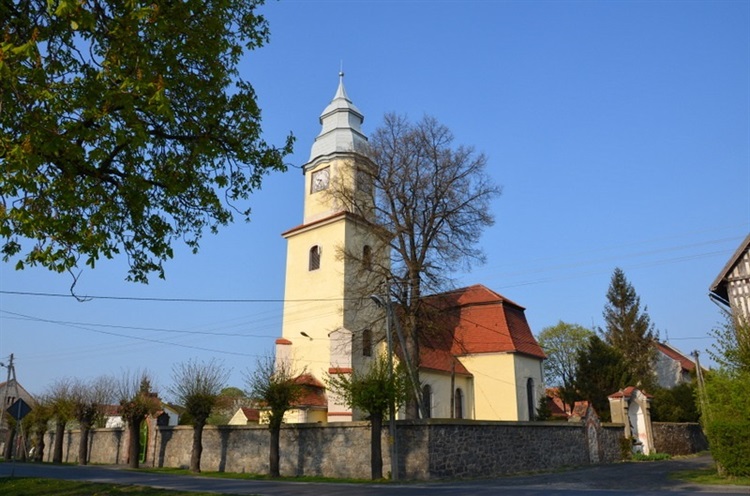 Kościół zbudowany został w 1335 roku. Jest to obiekt orientowany, murowany z wieżą od zachodu poprzedzoną niewielką kruchtą i węższym prezbiterium od wschodu. Na przestrzeni wieków kościół był rozbudowywany. W latach 1756 – 59 świątynia została rozbudowana w stylu barokowym - w 1785 r. podwyższono i nakryto barokowym hełmem wieżę świątyni, w roku 1861 wg projektu królewskiego radcy budowlanego Gandtnera wykonany został nowy hełm wieńczący wieżę oraz empora obiegającą nawę, na której w 1879 r. zamontowane zostały zachowane do dziś organy firmy Schlag & Sohne.