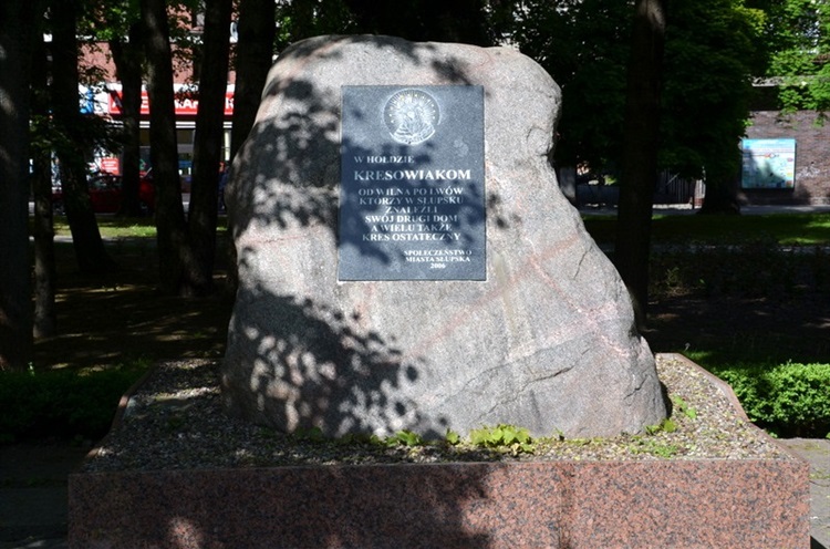 Na skraju parku im. Jerzego Waldorffa od strony ul. Jana Pawła II usytuowany jest głaz narzutowy z tablicą pamiątkową poświęconą tym, którzy w wyniku powojennych zmian granic Polski zostali zmuszeni do opuszczenia swoich rodzinnych stron i domów. Na tablicy pamiątkowej umieszczonej na głazie widnieje napis o treści „W HOŁDZIE KRESOWIAKOM OD WILNA PO LWÓW KTÓRZY W SŁUPSKU ZNALEŹLI SWÓJ DRUGI DOM A WIELU TAKŻE KRES OSTATECZNY - SPOŁECZEŃSTWO MIASTA SŁUPSK 2006”. Powyżej napisu umieszczony jest wizerunek Matki Boskiej Ostrobramskiej. Tablica pamiątkowa odsłonięta została 4.11.2006 r.