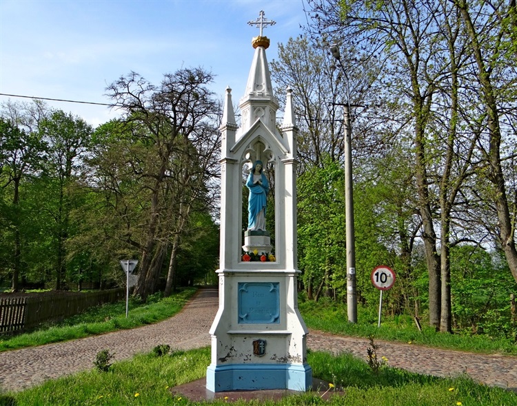 Przy drodze do Oronnego, na skrzyżowaniu z brukowanym traktem prowadzącym do starego młyna, grobli przy stawie i dalej ku Krępie, stoi piękna neogotycka kapliczka. Trójboczna, w górnej części ażurowa, zwieńczona smukłymi wieżyczkami (pinaklami). Na cokole umieszczono herb Jelita Zamoyskich i Pilawa Potockich oraz inskrypcję „Bogu za rodziców”. Zbudowana została około połowy XIX w. Ustawiona wewnątrz niej figura Matki Boskiej pochodzi z późniejszego okresu.
