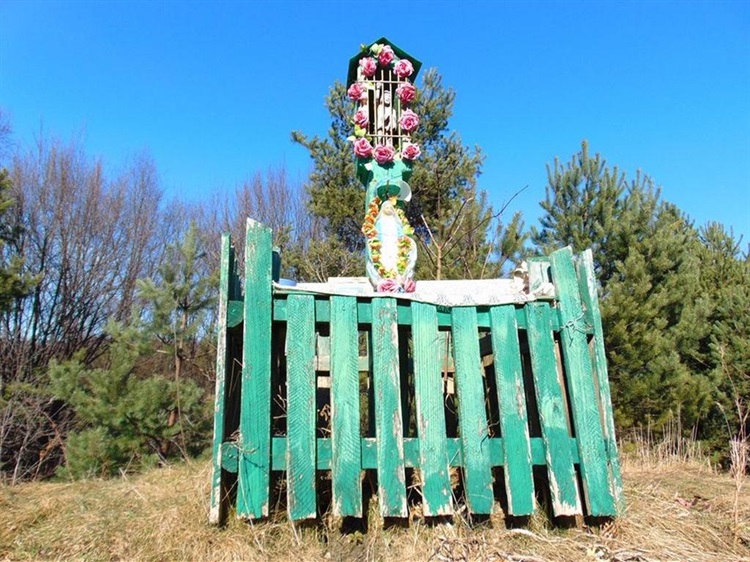 Na początku drogi, w pewnym oddaleniu od chałup stoi na słupku, ogrodzona drewnianym płotkiem mała kapliczka z figurką świątka, którą wyrzeźbił miejscowy artysta. Kapliczka jest klasycznym przykładem twórczości miejscowych, ludowych artystów, którzy przestrzeń wokół nas ozdabiają takimi małymi miejscami kultu religijnego.