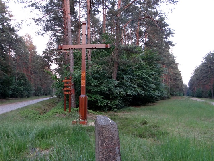 Pamiątkowy krzyż stanął na prowadzącym z Drezdenka do Sierakowa transpuszczańskim szlaku tzw. Trakcie Drezdeneckim (Drezdenkowskim, Drezdeńskim), którym od 1984 r. poruszają się pielgrzymi Szczecińskiej Pieszej Pielgrzymki na Jasna Górę. Ufundowali go pracownicy nadleśnictwa, członkowie Stowarzyszenia Inżynierów i Techników Leśnictwa i Drzewnictwa oraz koła łowieckiego Cietrzew. Ramiona i trzon krzyża posiadają delikatne zdobienia rzeźbiarskie. Zadbano również o pamiątkową inskrypcję „30 PIESZA PIELGRZYMKA SZCZECIŃSKA 2.VIII.2014”. Poświęcenia dokonał Dyrektor Szczecińskiej Pieszej Pielgrzymki ks. Paweł Ostrowski.
