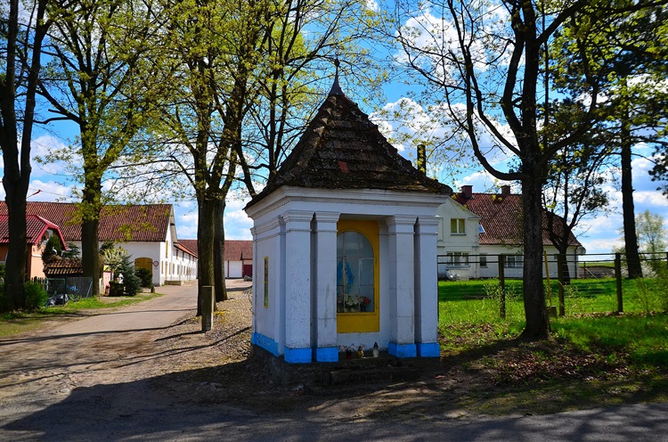 Powstanie tej budowli jest ściśle związane z istniejącym tuż obok niej dawnym dworem, gdyż przedstawia ten sam styl i datę, dlatego też można użyć stwierdzenia iż nierozerwalną częścią tej szlacheckiej posesji. Zwłaszcza gdy przyjrzymy się jej konstrukcji. Kapliczka posiada prosty korpus na rzucie kwadratu, nad całością góruje wysoki czterospadowy dach namiotowy kryty czerwoną dachówką. Od strony frontowej wydzieloną dużą o półkolistą niszę flankują podwójne kwadratowe kolumienki, w środku centralnie ustawiona figura Matki Bożej. Tył budowli skierowany na dawny dwór, to aneks z wejściem obudowany analogicznymi kolumienkami, wewnątrz na podniesieniu figura Maryjna i św. Antoniego.